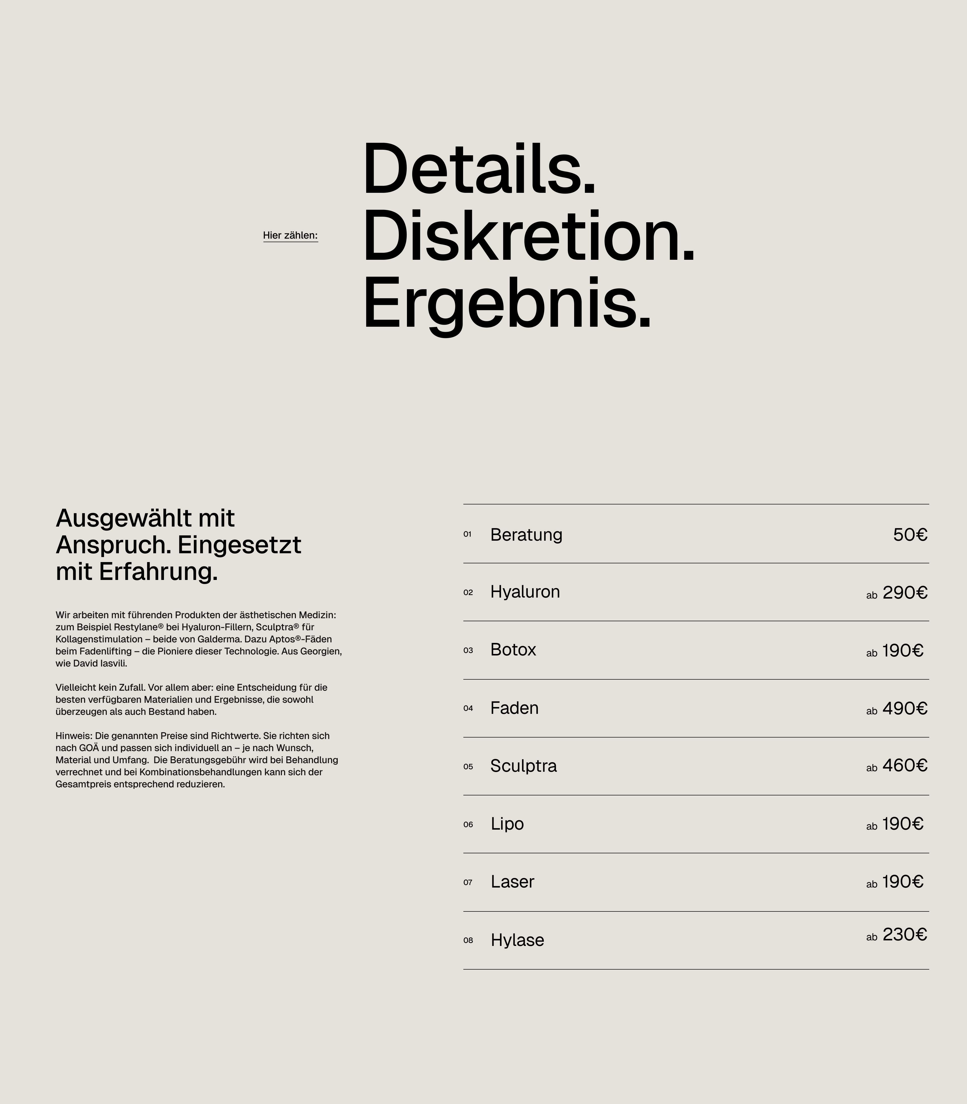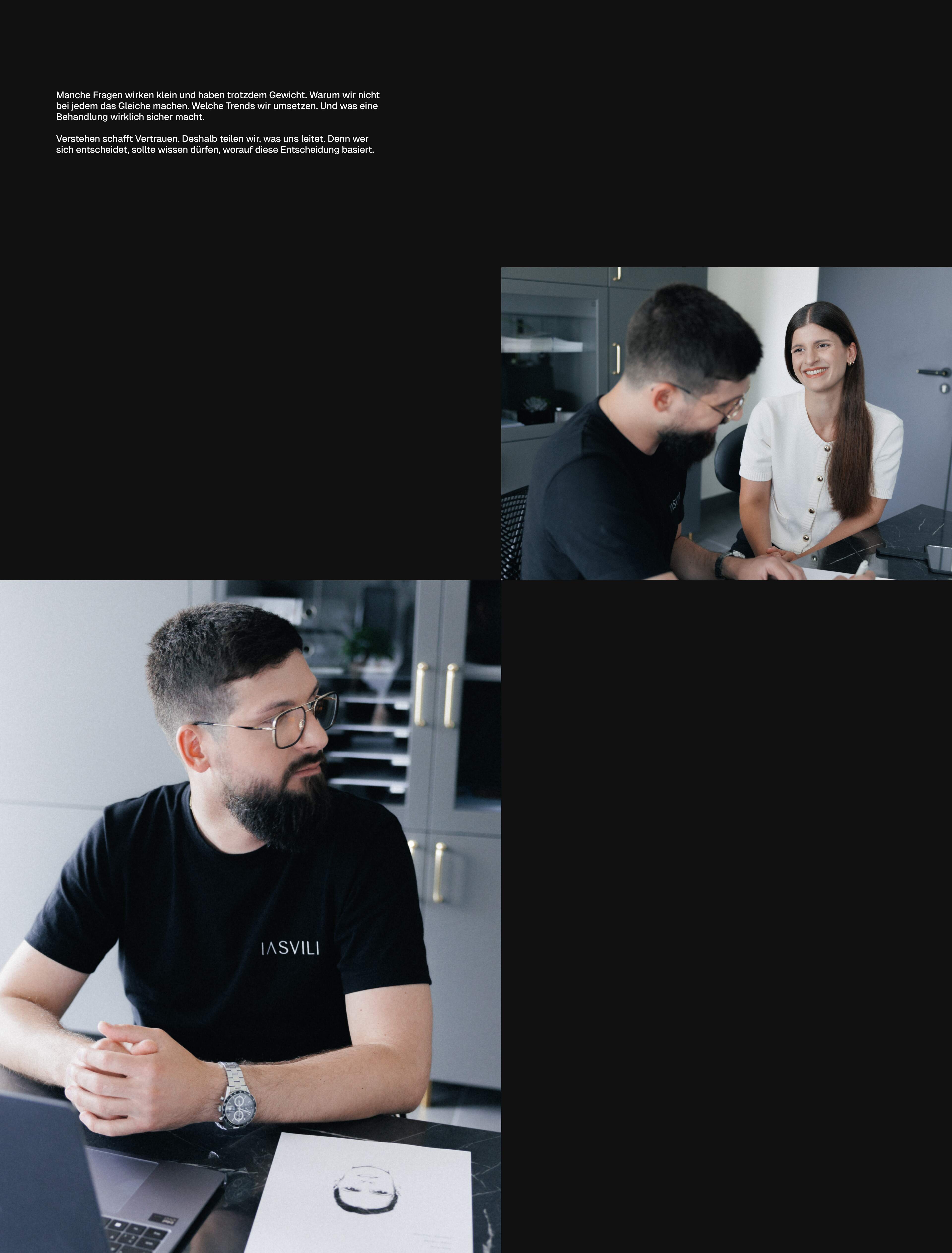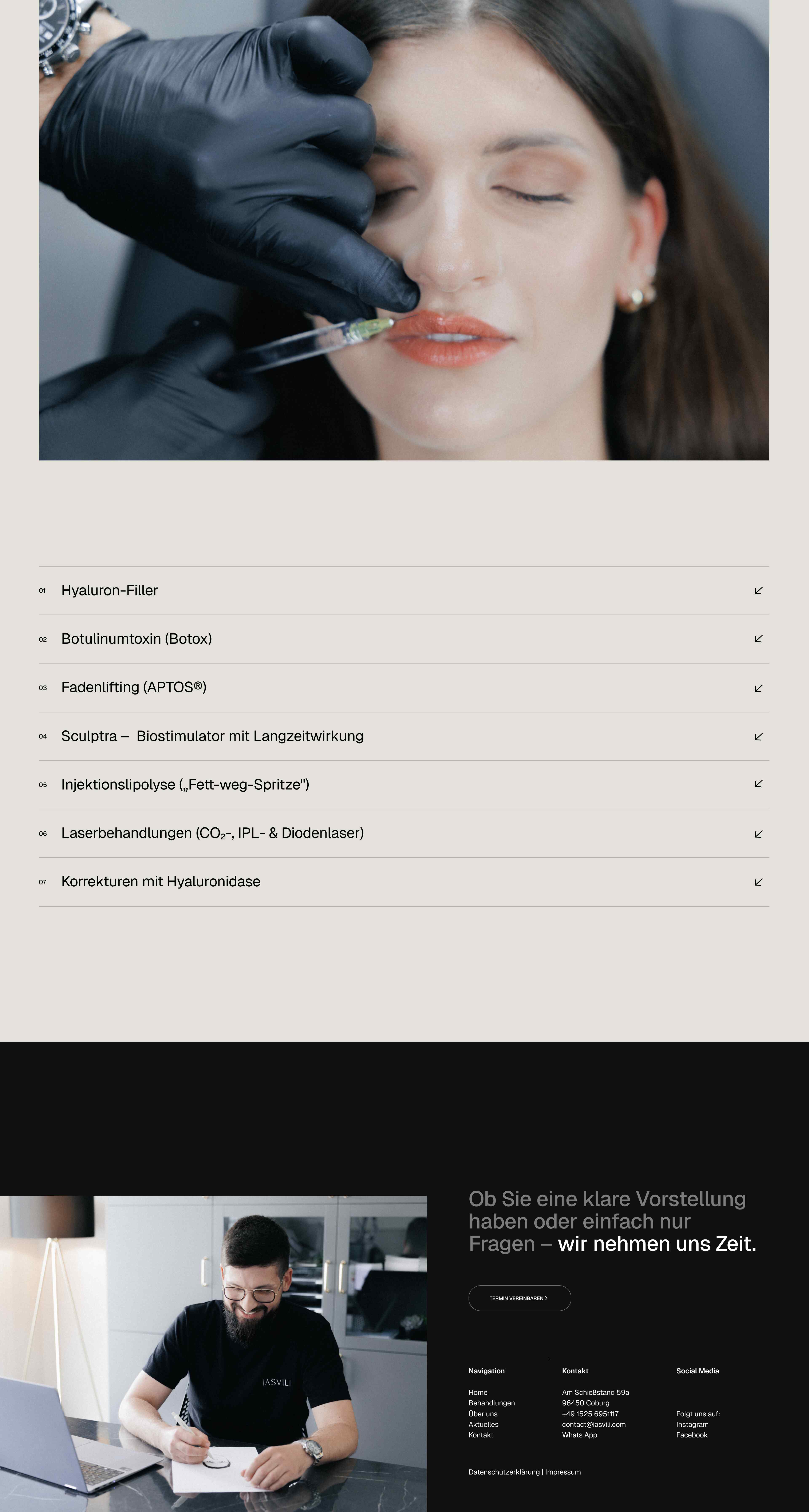 Online haben wir ein digitales Schaufenster kreiert, das durch „Visual Silence“ besticht. Viel Weißraum und eine bewusste Bildsprache geben Behandlungen eine Bühne, die Vertrauen schafft, ohne laut zu sein. Eine User Experience, die medizinische Expertise und ästhetischen Lifestyle nahtlos miteinander verwebt. IASVILI zeigt, wie modernes Praxismarketing funktioniert: Weg vom Austauschbaren, hin zu einer unverwechselbaren Brand mit echter Substanz.